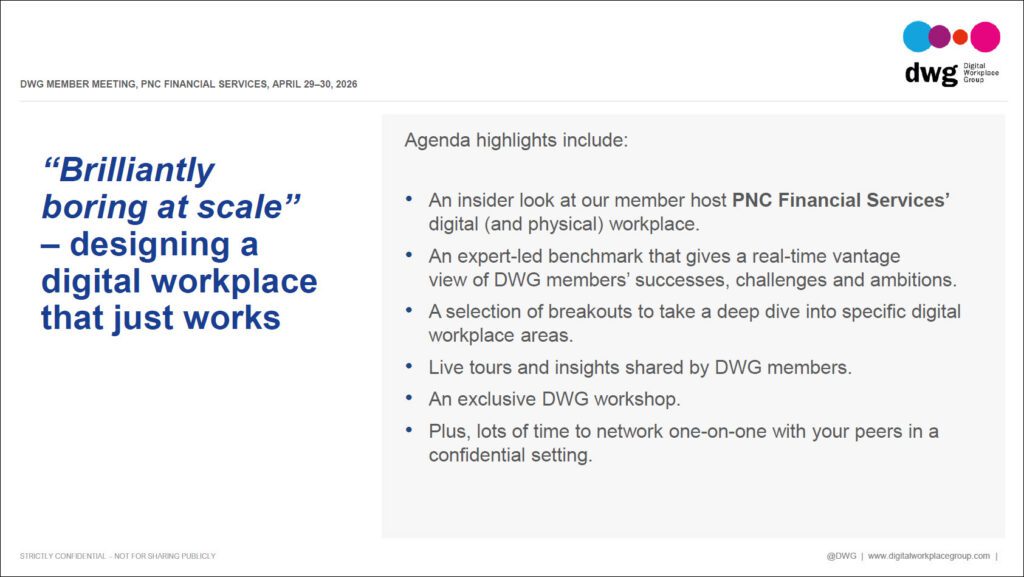 DWG Member Meetings are reserved for for digital workplace leaders and practitioners from Fortune 1000, FTSE 100 or equivalent private and public sector organizations. Suppliers, consultants and students are not eligible to participate.