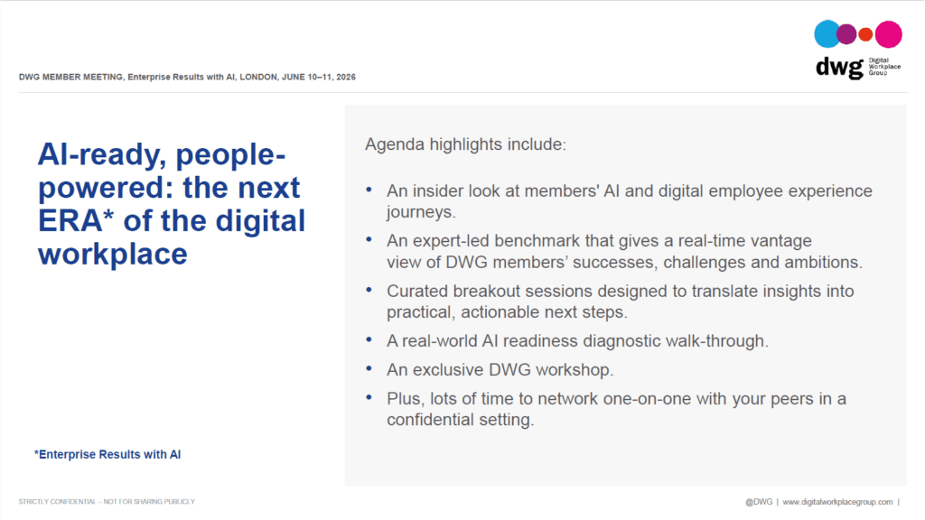 DWG Member Meetings are reserved for for digital workplace leaders and practitioners from Fortune 1000, FTSE 100 or equivalent private and public sector organizations. Suppliers, consultants and students are not eligible to participate.