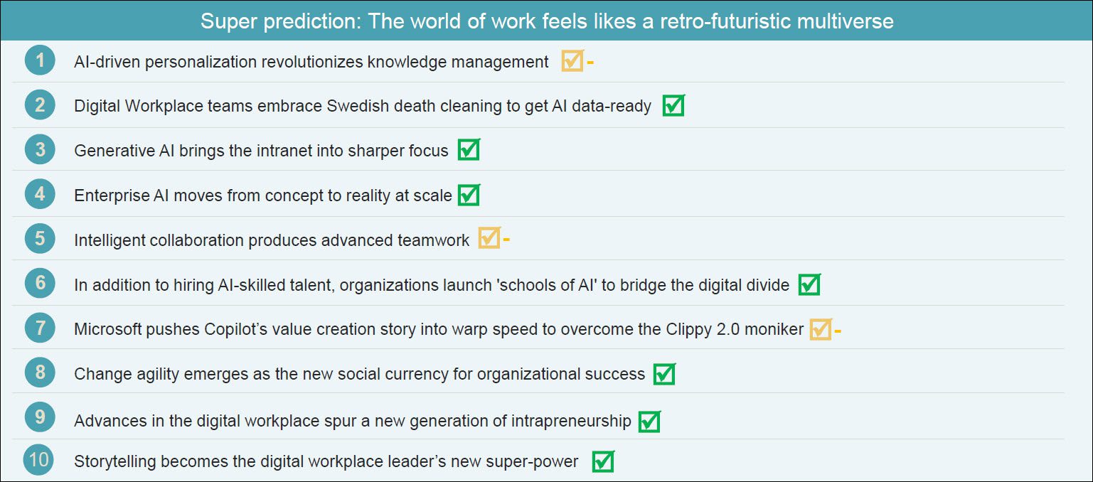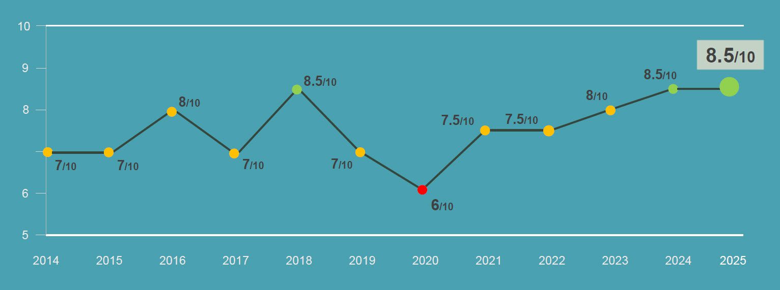 Since DWG’s predictions for the digital workplace debuted in 2014, we’ve seen highs (2018: 8.5 out of 10) and lows (2020: 6 out of 10 during the height of the pandemic). After rounds of conversations with DWG members, colleagues and our wider community, we're pleased to announce that 2025 marked another high point in our annual performance, landing 8.5 out of 10!