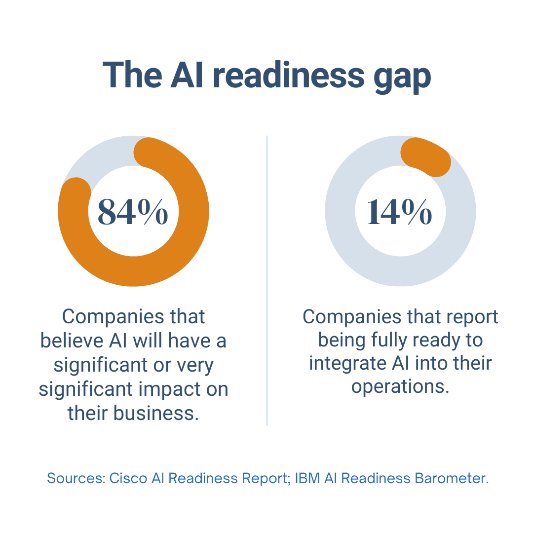 Recent studies highlight the substantial gap between companies' recognition of AI's potential impact and their actual readiness to implement it. While 84% of companies believe that AI will have a significant or very significant impact on their business, only 14% feel they are fully prepared to integrate AI into their operations.